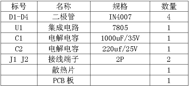 一、电路说明LM78系列是美国国家半导体公司的固定输出三端正稳压器集成电路。世界各大集成电路生产商均有同类产品可供选用,是使用极为广泛的一类串连集成稳压器。该芯片内置过热保护电路,无需外部元件,输出晶体管安全范围保护。内置短路电流限制电路。电压范围:7805 7806 7808 7809 7812 7815 7818 7820 7824。本套件默认配备7805,是一个常用的5V的集成稳压电路;本电路结构简单,性能良好,是职业学校电子技术课程实践的典型电路。电路中D1-D4为整流二极管,C1、C2是滤波电容,安装时一定要注意其极性。IC1是78系列三端稳压器,输出为正电压、