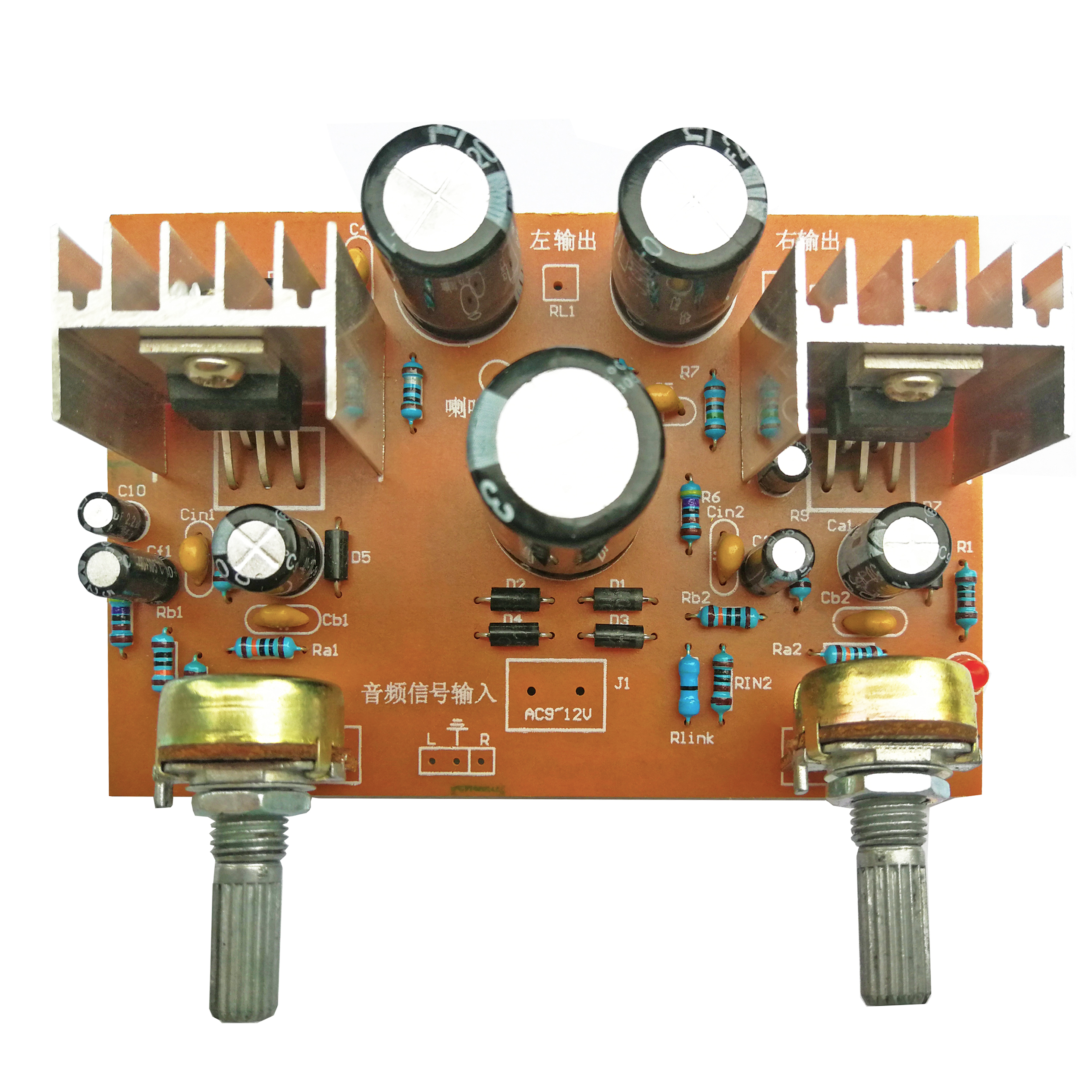 采用两块TDA2030A功放集成块,OTL双声道输出,带左右声道音量调节电位器和散热器。