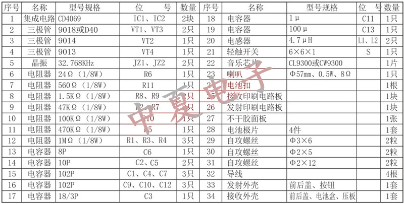 中夏牌YKML-I型无绳门铃采用先进的脉码调制发射及石英晶体振荡的稳频技术,使其具有遥控距离远(达30米以上)、工作性能稳定、制作成功率高、静态功耗低、体积小等优点。适合于广大的无线爱好者装配使用。